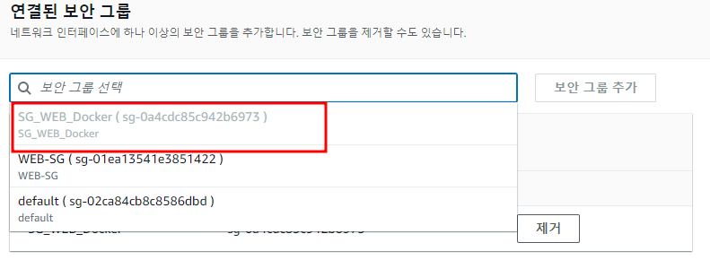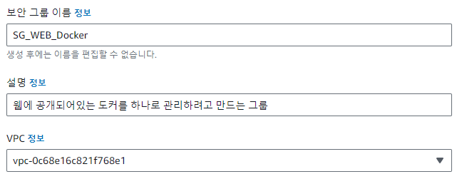 우선 도커를 까니까 보안그룹은 도커환경을 별도로 하여 보안그룹을 해주는게 관리하기 편할것이다.