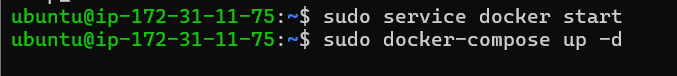 그리고 sudo service docker start 하고 sudo docker-compose up -d 하기 (도커 컴포즈에서 아까 만들어준 docker-compose.yml 파일을 설치하는 것이다)