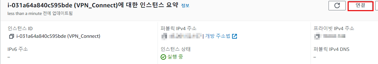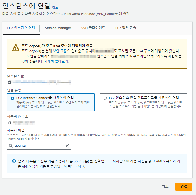 그리고, EC2 인스턴스 연결을 클릭한다(현재 상태에서는 퍼블릭 주소가 있어야지만 연결이 가능하다)