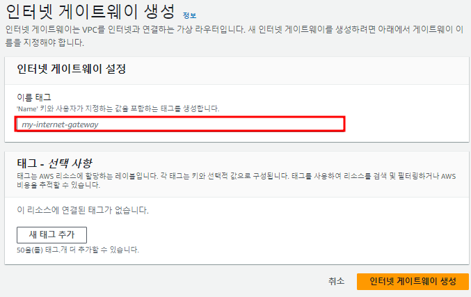 3. VPC 대시보드에서 인터넷 게이트웨이 클릭 후, 인터넷 게이트웨이 생성하기 클릭